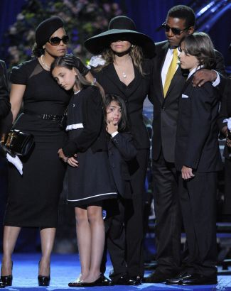 Janet Jackson (esq.), La Toya Jackson (centro), Randy Jackson (dir.) e os filhos de Michael Jackson Paris Jackson (2ª à esq.), Prince Michael II (centro) e Prince Michael I (1º à dir.) se abraçam ao final da homenagem ao cantor em Los Angeles. Mais